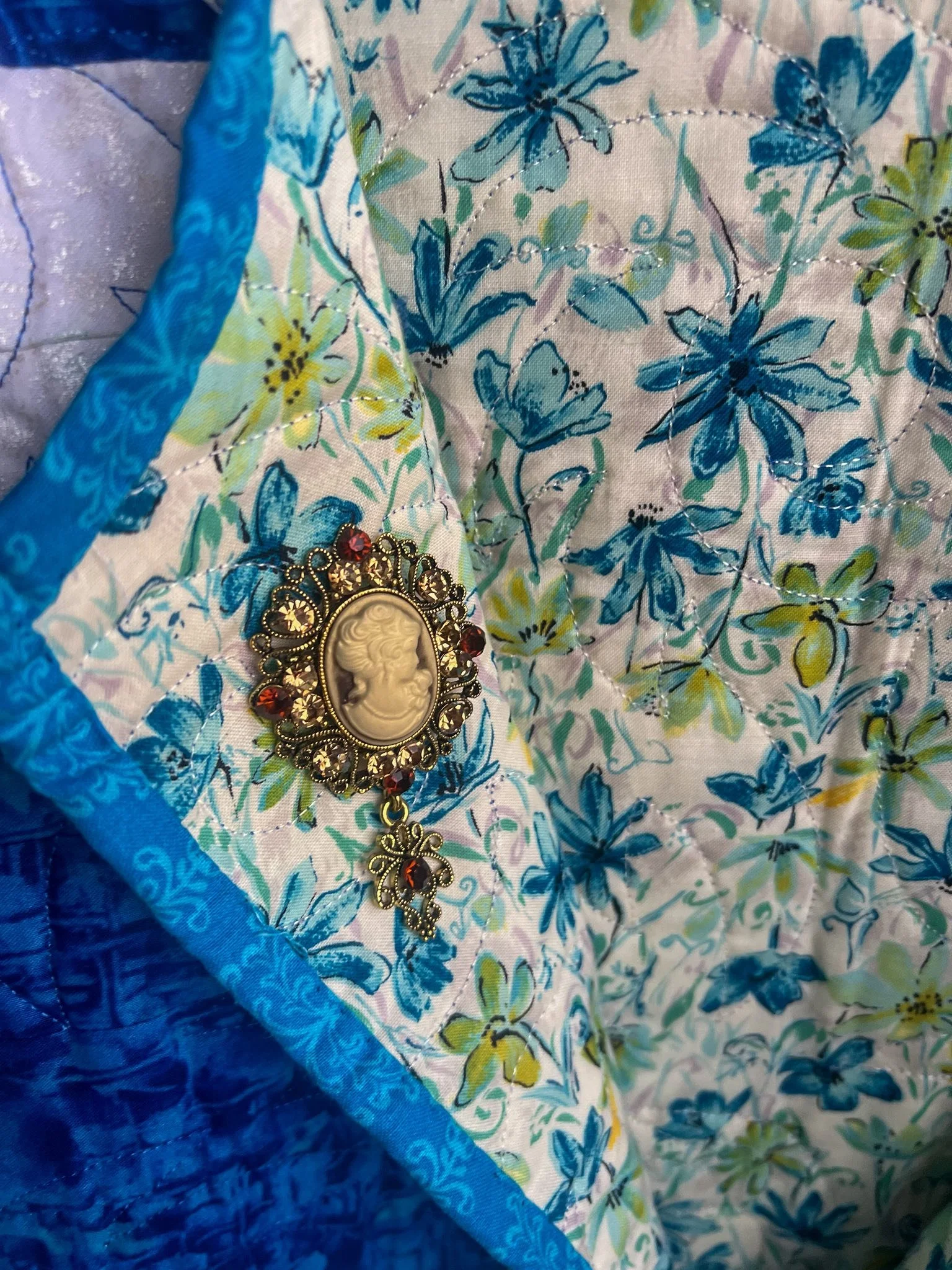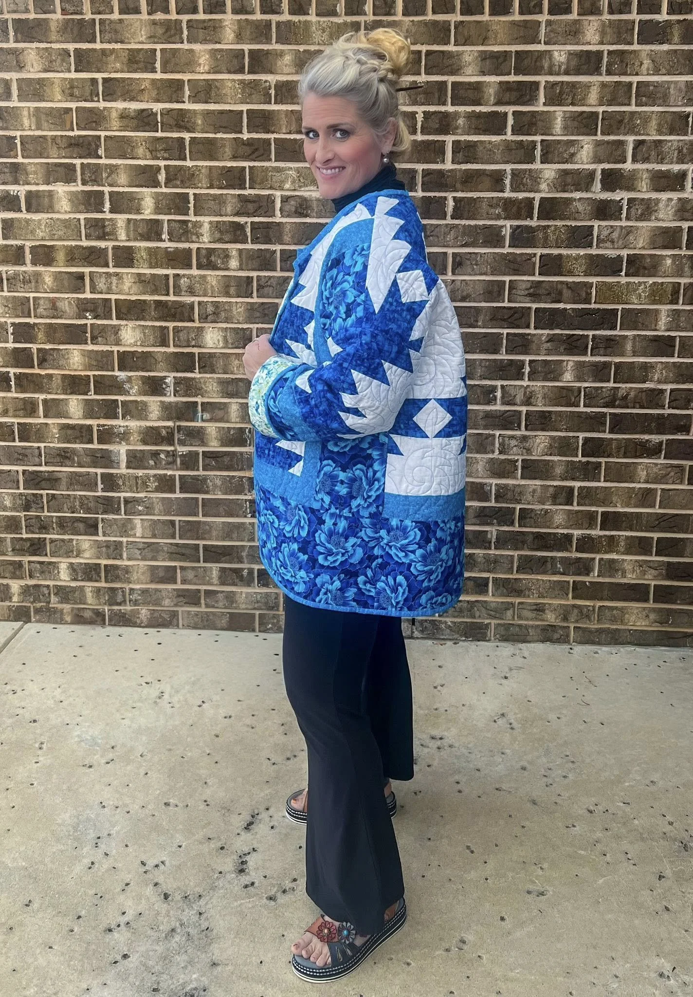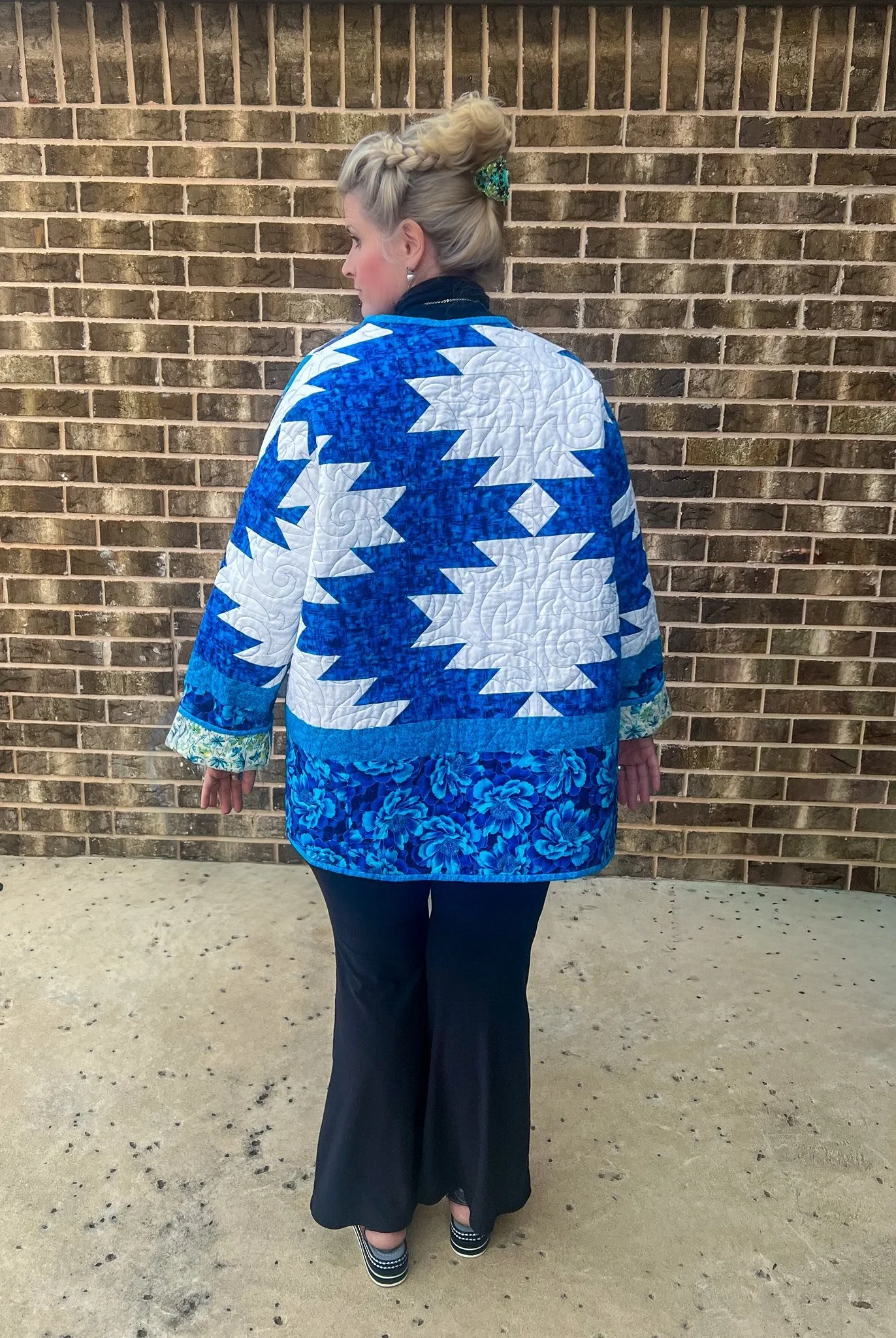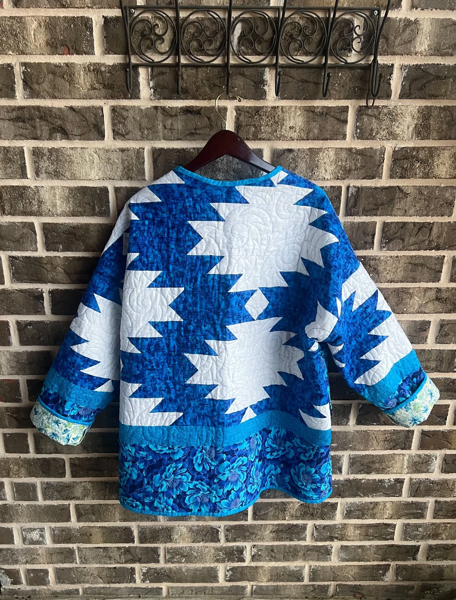 One thing Cherie loves almost as much as quilting is boots—the craftsmanship, the patterns, and the storytelling stitched into every pair. When she found this quilted piece, the artwork of the quilt immediately caught her attention. Its shapes and lines reminded her of the classic boot-making patterns used by skilled cobblers, full of style, structure, and personality.