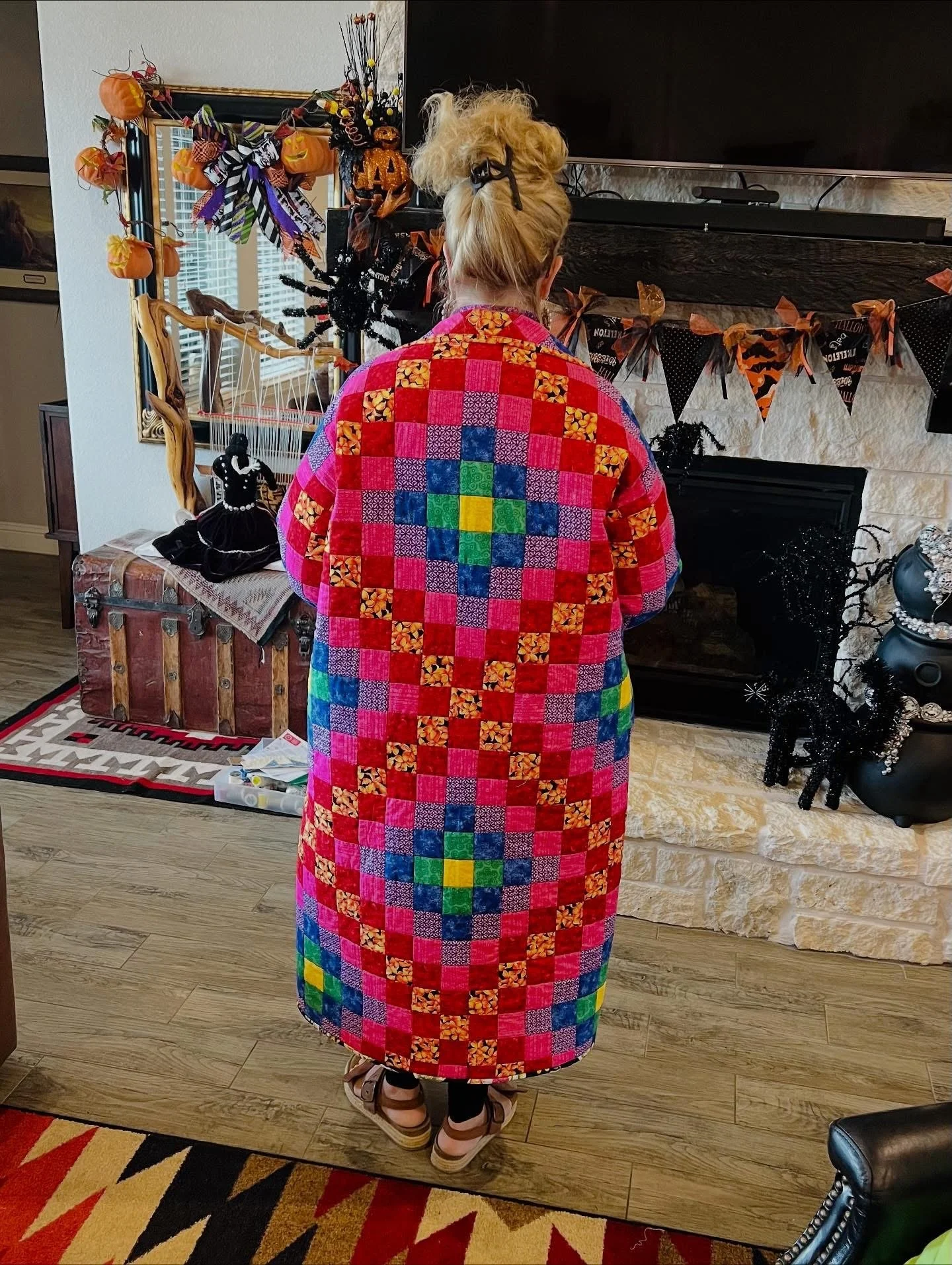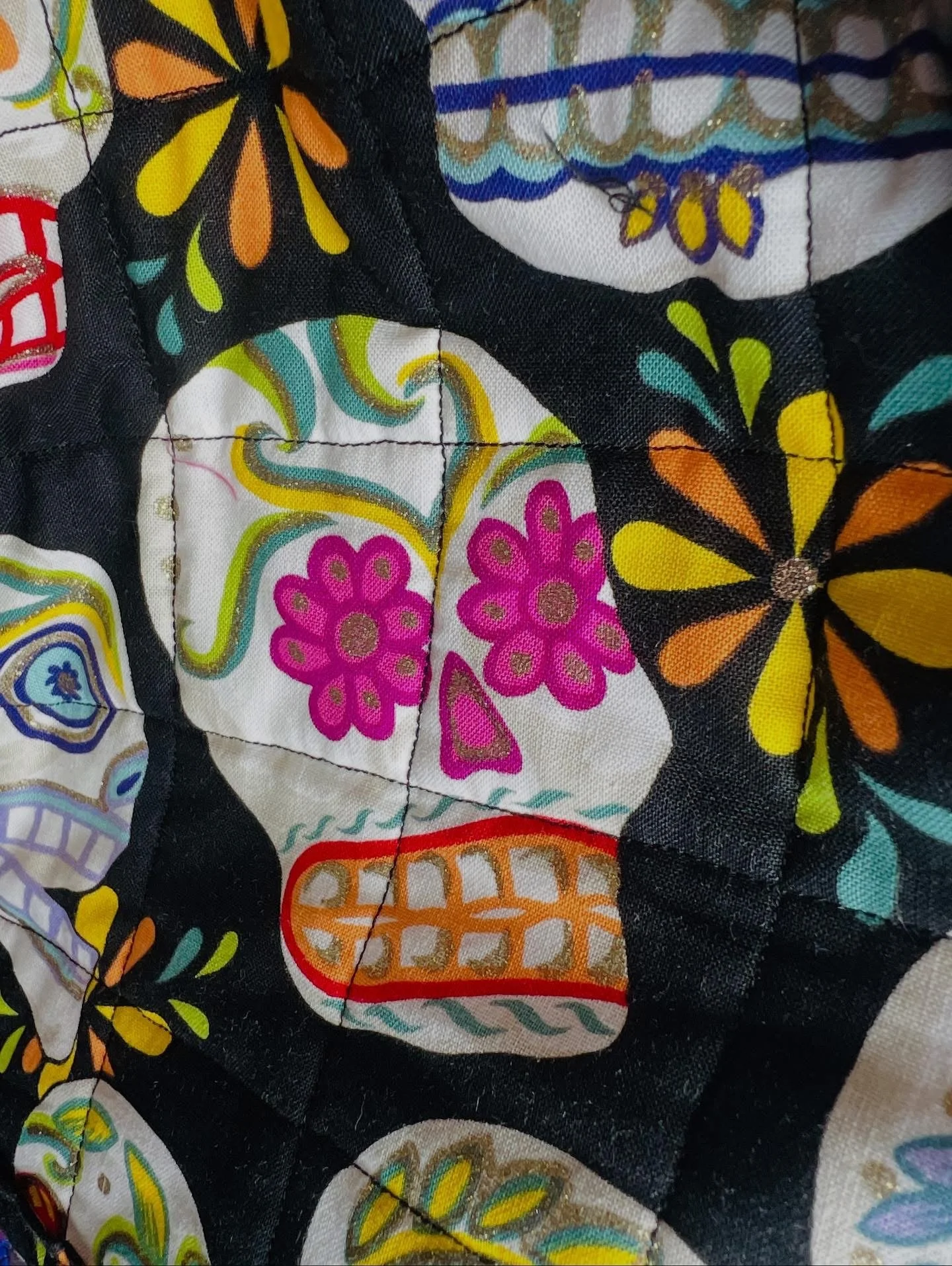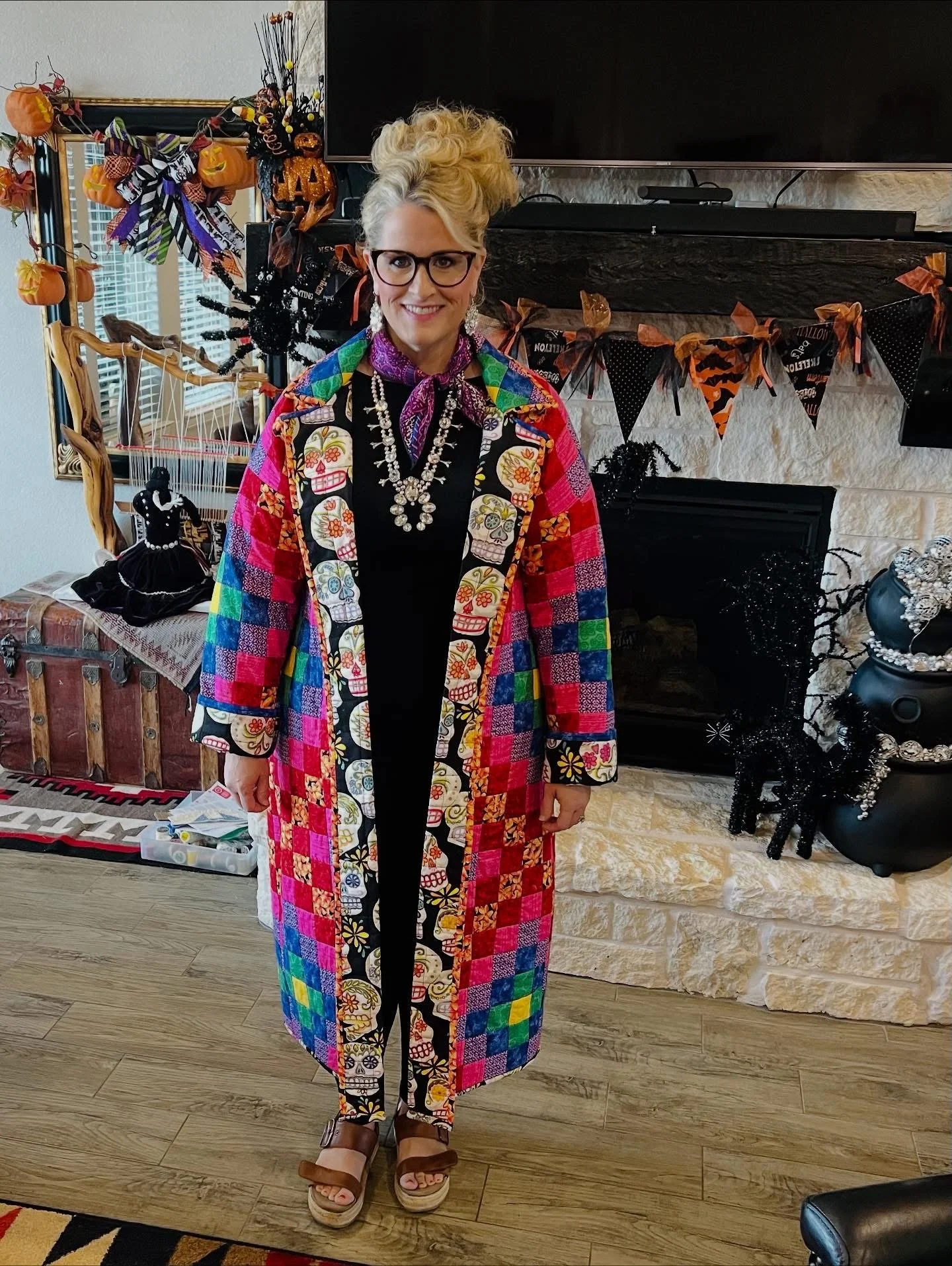 So she did. With one bold decision, she cut into a beloved piece of fabric and created what would become her first true masterpiece: the Day of the Dead quilt coat. It was imperfect, iconic, and deeply hers. And it lit a spark.